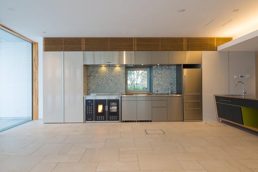 こちらはK棟増築部分に完成した、コミュニケーションセンター。住民や地域の方が利用できるキッチンを完備、太陽熱温水器や木質ペレットの調理器を軸としたユニークな設備設計で、4kWの太陽光発電と12kWhの蓄電池を搭載しているため、オフグリッド運転に近い状態となっており、災害時も自立運転で煮炊きしたりお湯を作ったりが可能です。アイランドキッチン部分は可動式で、下記の写真はセミナー形式での利用の際のレイアウトとなっております。