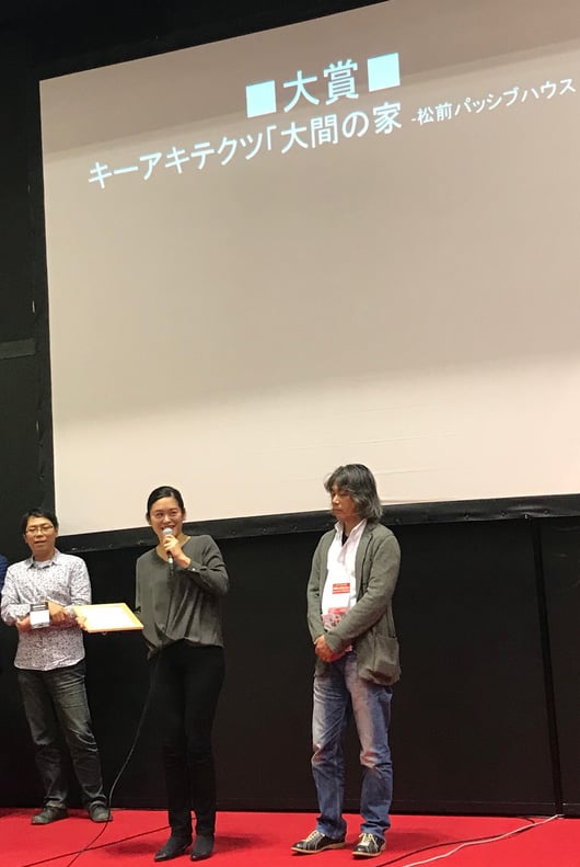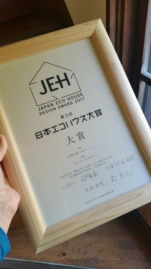 この度は大変光栄なことに、建築知識主催の日本エコハウス大賞2017の新築部門にて、大賞を頂きました。ノミネートされた作品は2016年竣工の大間の家。施工のアーキテクト工房ピュアの高岡社長と共に表彰舞台に上がりました。