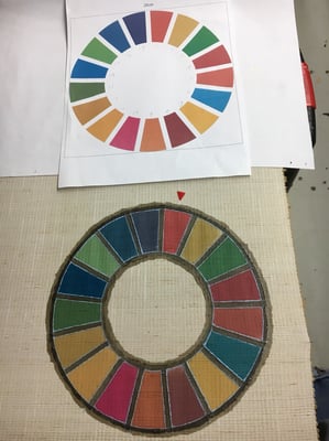 これが手元に届いた反物です。SDGsのカラーホイールはどちらかというと「カワイイ」系なので、フォーマル用というよりも少しカジュアルな和装で、大島紬などにも合うようなデザインとして頂きました。これはもうたまりませんね!! これから東京の和裁士さんが帯に仕立てて下さります。もう出来上がりが楽しみで仕方がありません・・・。