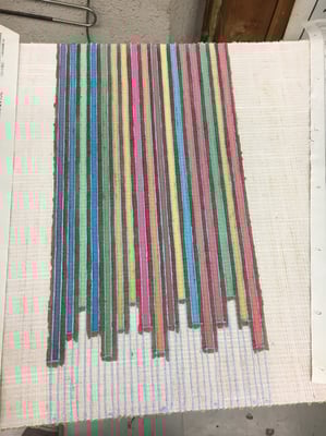 体の前に来る帯の柄は、同じ17色を使ったストライプにしてみました。乾くと若干色が薄くなるので、厳密に色を再現する事は本当に難しいのですが、それが手染めの良さであり、世界でひとつだけのモノづくりの贅沢だと感じました。何事も機械化され、同じ品質のものが早く大量に出来る時代だからこそ、手作りの価値が判るのかも知れませんね。