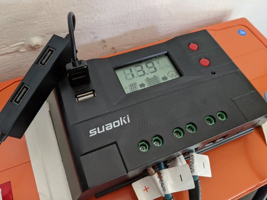 太陽光パネルと蓄電池を繋ぐのがこちらのバッテリーコントローラー。左から順に、太陽光パネル、蓄電池、負荷と接続します。負荷に関しては12V以外に、左上に5VのUSBコンセントが2つ付いているので、もっぱらこちらを活用してしまいがち。電池容量を確認しながら、ここからどんどん電気を使ってみることになりました。