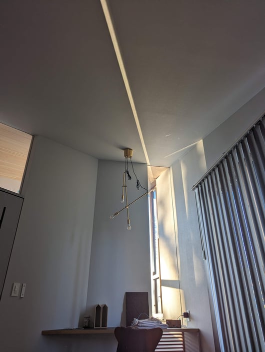 ところで先日南西を向いた寝室で目覚めた際、部屋の天井に写真のような光が差し込みました。朝日は東から登ってくるのにどうして西側の部屋にこんなに強い光が?と一瞬意味がわからなかったのですが。おそらく南東のコーナーガラスから入射した朝日が、南西のコーナーガラスに反射して、それが更に室内のガラス壁を透過して寝室に達したのでしょう。流石にそこまでは設計段階で予測してませんでしたね(笑)。