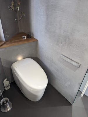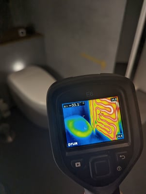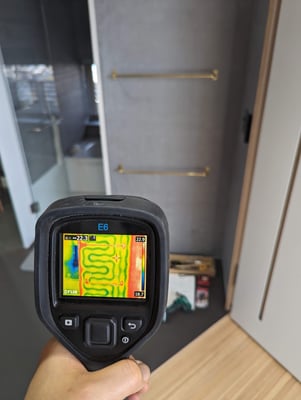 土壁暖房の回路がようやっと動き始めましたので、サーモカメラで配管の位置を確認しながら、脱衣室のトイレリモコンやらタオルバーやらを取り付けております。なかなかドキドキしますね(笑)。