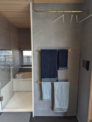 タオルバーに関しては、既製品だとピッチが合わないので、toolboxでミリメーター単位で長さを指定出来る真鍮のタオルバーを購入しました。あまりにも長い時間格闘していて壁中の温度が上がってしまい、どんどん不安になったので、一旦回路を切って、暫くしてから最終確認しました。という訳で、サーモカメラには冷水回路のように映ってしまっておりますが(笑)。こんな難易度の高い作業を新津組の堀内監督にさせてしまうのも申し訳ないので、施主自ら取り付けを行いました・・・。ということで、遂にタオルがバイオマスと太陽熱エネルギーでホカホカに。