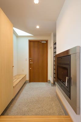 キーアーキテクツで基本設計のお手伝いをさせて頂いた、近江八幡のH邸、無事に完成いたしました!玄関に入るとそこにはビルトインされたペレットストーブが・・。