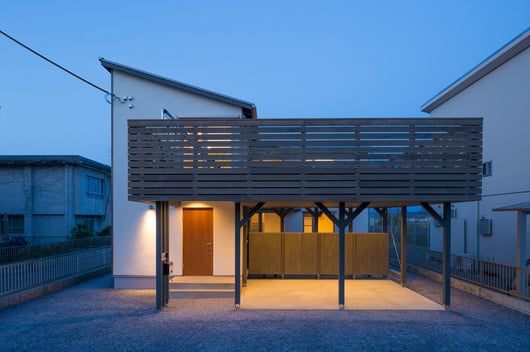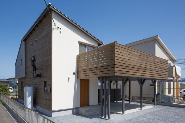 南から45度振れているという、パッシブデザインの難易度が高い敷地で、年間暖房負荷30kWh/m2を狙って断熱性能を逆算したり、開口部のデザインを行いました。積雪も多いこの地域では、車はやはり2台必須という事で、屋根付きのカーポートを設けました。今回設置されたペレットストーブにはウィークリータイマーが付いているため、例えば”月~金は17時に着火、21時に消火”といった制御が可能です。仕事を終えて家に入った時、綺麗な炎を見てホッとして欲しいな、という想いで、ストーブは玄関設置となりました。