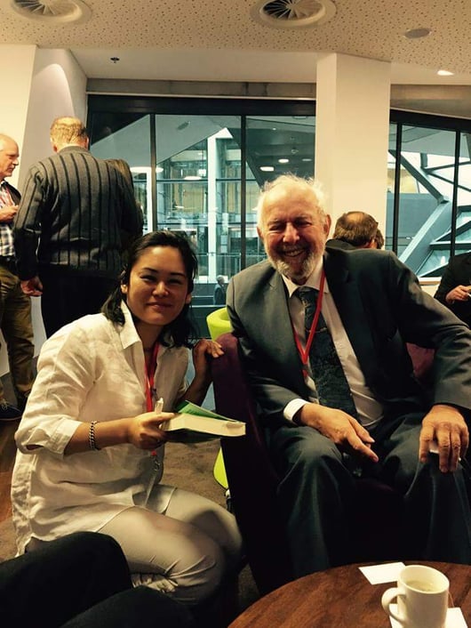 4月22-23日で開催された第20回国際パッシブハウス・カンファレンスにて、なんとファクター5の著者である、ヴァイツゼッカー(Ernst Ulrich von Weizsaecker)博士と直接お話する機会がありました。今年77歳になられる博士は、昨年末に休暇中に骨折されたとの事で、会場には松葉づえを付いてお越しになられました。しかし頭の方は全く衰えること無く、カンファレンス最終日のパネルディスカッションでは、ジャーナリストのフランツ・アルト(Franz Alt)氏の楽観的なコメントにはお構いなしで、鋭い指摘を連発されました。フォルクスワーゲン社による燃費偽装を例にあげ、資本主義の行きつく先はお金のためなら人を騙すという、倫理観の欠落した社会であると断言され、世界を戦争へと引きずり込もうとしている勢力に対して、怒りをあらわにされていました。