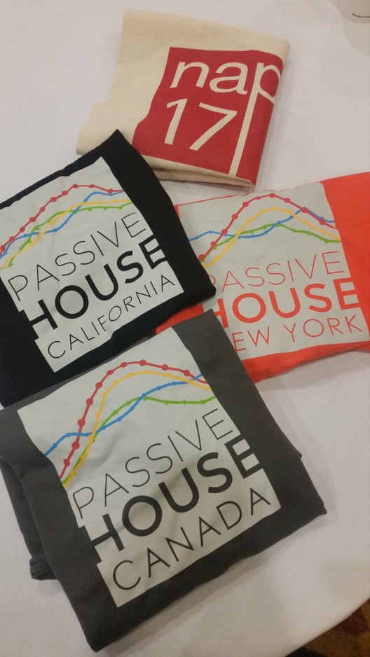 10月5~8日の4日間で、カナダ、ニューヨーク、カリフォルニアの3つのパッシブハウス推進団体が主催する北米パッシブハウスネットワークの2017年のカンファレンスに参加して参りました。写真はカンファレンスで販売されていたオリジナルTシャツ。この折れ線グラフは、PHPPのClimate Dataシートに表示される、各都市の月ごとの外気温と露点温度、そして南と西の垂直面に入る日射量ですが、そのままTシャツのデザインになっていてとても面白いなと思いました。これだけ気候に差がある北米ですが、地球温暖化に歯止めをかけるべく、お互いに情報交換をし合い、リソースの共有を重んじて連携しています。そこに沢山の建材メーカーや設備メーカーが協賛しており、各都市の行政の取り組みなども発表され、大きな関心が集まっている事を肌で感じました。北米には夏に蒸し暑い地域もありますので、夏に関してのパッシブハウス・ジャパンの取り組みや事例報告を是非して欲しいと今回声をかけて頂き、キーアーキテクツの森もカンファレンス2日目に30分程のプレゼンテーションを行いました。何しろ驚いたのは、今回のカンファレンスのメインスポンサー3社の内の2社は、ダイキンと三菱という日本のエアコンメーカーである事でした!躯体の高性能化に伴い、早く従来のエアコン式から脱却したよりスマートな冷暖房設備を商品化して頂きたいですね。