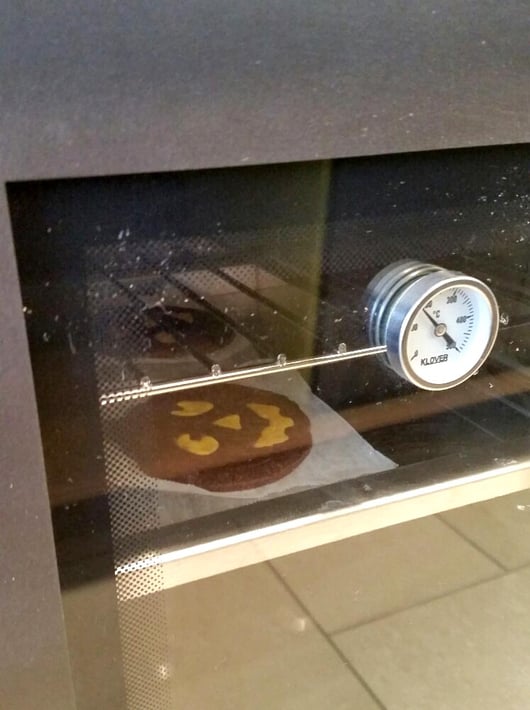 クッキーを焼くには170℃~180℃が必要なので、今回はオーブン出力を一番低くしてストーブを運転しました。アナログの温度計がガラス面に付いていますので、こちらから庫内の温度が180℃と読み取れます。写真にはガラス面に床のタイルが写りこんでしまっているのでちょっと変ですね。