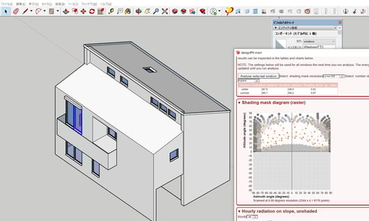 最近はオンラインセミナーでデモンストレーションをする機会も増え、まあまあ使いこなせるようになってきたDesignPH2。今日は狭小地域に建つ住宅の日射の入り方をシミュレーションしました。今日は中くらいの解像度で、1枚の窓に対する解析ポイント数は4です。画像右にあるShading mask diagramは、室内からガラスを介して外を眺めた状態。月毎、時間毎の日射の取得状況が判るので、パッシブデザイン極めたい人は是非チャレンジしてみてください。