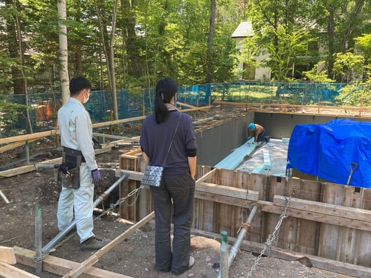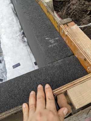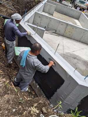 真っ白なベースコートが乾いたら、今度はトップコートに防水性能のあるダークグレーの左官材が施工されました。念のため、基礎の捨てコンに折り返すようにメッシュを伏せ込んで頂きました。発泡ガラスボードはシロアリの食害を受けません。ですので今回はキーアーキテクツ標準の銅板による蟻返しがありません。一方で、発泡ガラスボードの熱伝導率は0.052W/mKと、寒冷地軽井沢のパッシブハウスにはやや心細いものがあり、今回は基礎内断熱を併用する設計です。基礎内断熱の割合が大きすぎると、冬季に基礎コンクリートの室内側の表面温度は下がる傾向にあるため、完全な基礎内断熱程では無いにしろ、結露やカビのリスクは上がります。したがって、現在は寒冷地でありながらも、将来的にシロアリが北上してくる可能性のある地域での基礎まわりの断熱の検討は、慎重になされなければいけません。