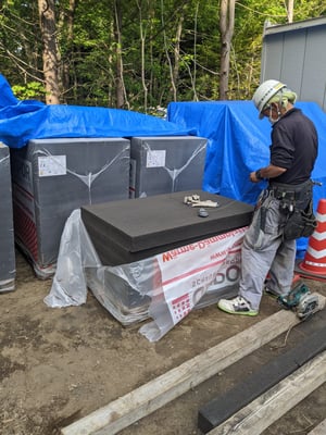 通常の断熱材よりももろく、切断の際に注意が必要ですが、出隅部分もとても丁寧に施工して頂いてます。因みに先日構造家の佐藤淳さんにこの材料を紹介したところ、断熱性能があり、圧縮強度も非常に高いため、月面基地の建設に採用したい!というコメントが飛び出しましたが、私は月や火星に移住出来ない大半の人々の暮らしを守る為にこの材料を地球で使いたいのですね(笑)。地球上での使用に興味のある実務者の方はStoJapanさんまでお問合せください・・。
