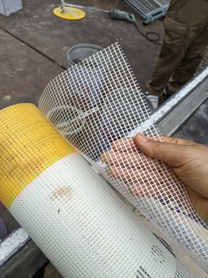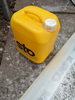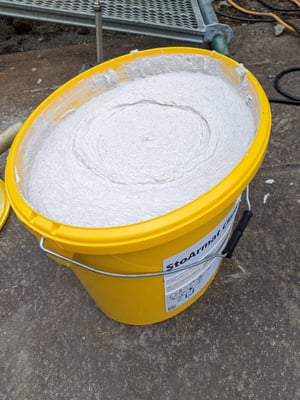 信濃追分の家の発泡ガラスボードが無事に基礎立ち上がりに打ち込まれましたので、今日はその仕上げ工程です。軽井沢は凍害がある地域のため、この発泡ガラスボードのベースコートにはセメントフリーの樹脂モルタルの使用が重要とのことで、StoJapanさんの施工指導の下、プライマー塗り、ベースコート+ファイバーメッシュ伏せ込みがスタートしました。Stoの湿式外断熱工法は、キーアーキテクツの設計で度々登場しますが、今回は基礎で活躍して頂くことになり、現場が突如黄色くなりました(笑)。