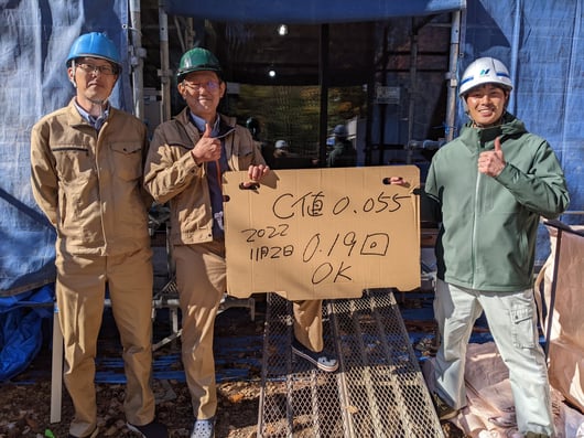 なんと、信濃追分の家の気密測定でC値0.055c㎡/㎡が出ました(減圧0.06、加圧0.05の平均値)。この0.05という値は、2009年の鎌倉パッシブハウスで達成した値で、当時は豆腐のようなシンプルな形の建物を2x6で施工し、インテロの気密シートのタッカーをテープ処理までして、30mmの設備配管胴縁まで設けて、私は毎日現場に張り付き、窓はドイツから輸入したパッシブハウス対応の窓、ヘーベシーベもありませんでした。しかし今日の値は、やや複雑な形を在来工法で組み、外壁には気密シートも使わず、PJパネルの目張りだけで、私は現場に週1も通えておらず、国産の木製サッシでワイド3200mmのヘーベシーベも台形のガラスコーナーもある状態で実測されました。パッシブハウス認定用にはC値0.3〜0.2を切れば良いので、いかに現場の施工性を上げて建材を国産化するかが鎌倉パッシブハウス以降の私の課題となっていましたが、13年の歳月を経て、当時と同じ測定士により同じ記録に戻ってきたことが、なんとも感慨深く、0.05の意味に、皆で思いを馳せました。