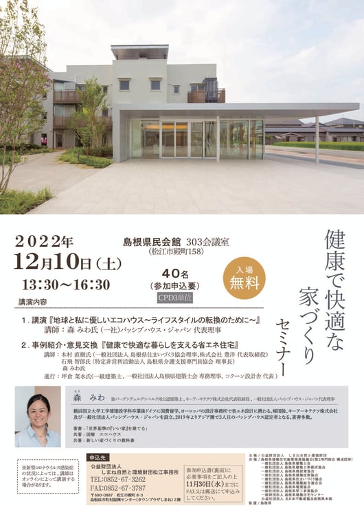 この度、島根県建築士会と公益財団法人しまね自然と環境財団の共催による講演会にお招きいただきました。土曜日開催ということで、一般の方にも聞きやすい内容を心がけたいと思います。お申し込みはこちらから。