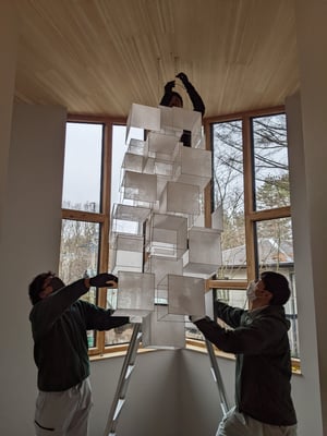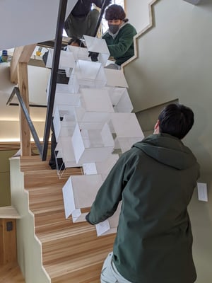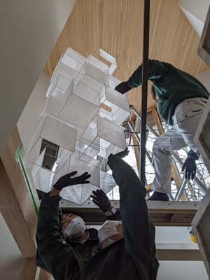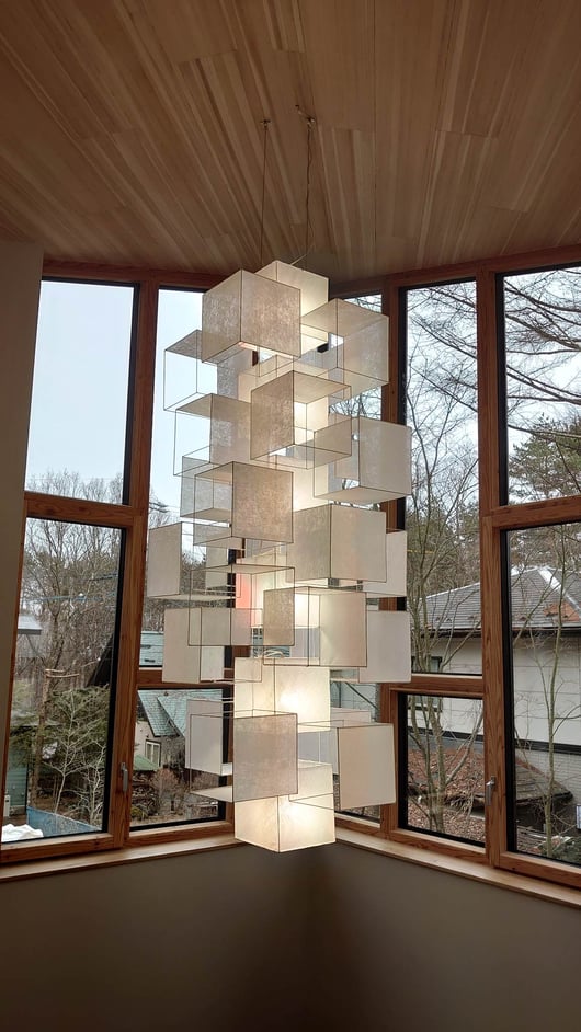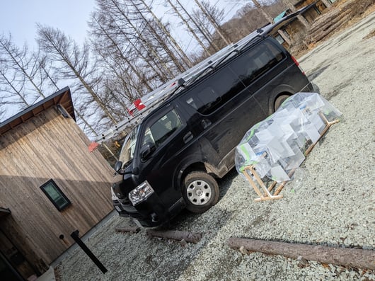 遂に、六花荘で保管されていたペンダント照明が信濃追分の家に向けて出発する日がやってきました。照明作家の鎌田さんが12月に制作を完了してくださっていたのですが、現場の受け入れ態勢が整わず(笑)、2か月近く床に横たわっていましたが、電気屋さんのバンに積み込むのも大変そうです・・。