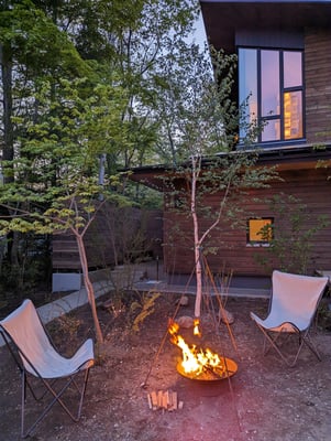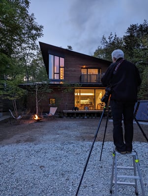待ちに待った追分の家の竣工写真撮影です。お天気も良くて、朝から齋藤カメラマンが休むことなく写真を撮り続けてくれています。ドローン撮影から始まり、外観から内観へ、そして一番忙しい夕景タイムが始まります。焚火もばっちりなタイミングで良い火力!