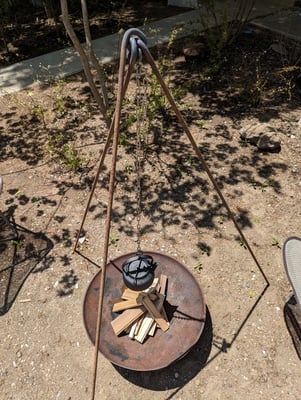 実は今回追分の家の内部階段手摺を制作してくれた河田崇さんが、私がドイツから運んだ焚火台用のトライポッドを制作してくれました!異形鉄筋曲げてこんな感じで―と私がメッセージを送った直後にささっと制作して下さり。それはもう、鉄を自由自在に操るマジシャンのよう。