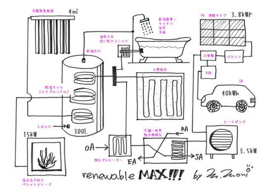 今日はSUUMOの記事用に、追分の家の設備計画のスケッチを更新しました。これまでのものは温水回路のみだったので、この機会に電気系統を追記してみました。一番苦戦するのはやはり車。普段から車に興味が無いので、形がどうにもわからない(笑)。