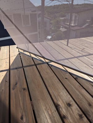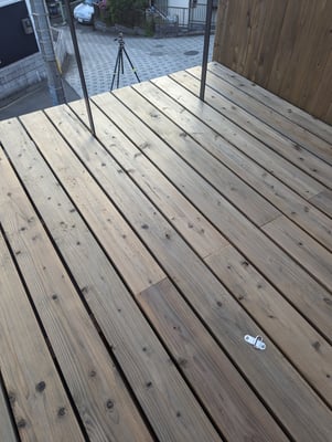これからお施主様の方でお庭の工事を進めていくため、今現在の建物の南側はややがらんどうではありますが、とても日当たりの良い敷地のため、逆に今後は植栽のパワーを抑えられるのかが心配な程です。念願のインフィニティ・デッキも屋久島地杉できれいに仕上がりました。スチール手摺はパラペットに固定していますが、デッキ仕上げはパラペットを超えて外に張り出すディテールとしました。解放感が半端ないですね。名付けて「インフィニティ・デッキ」(笑)。