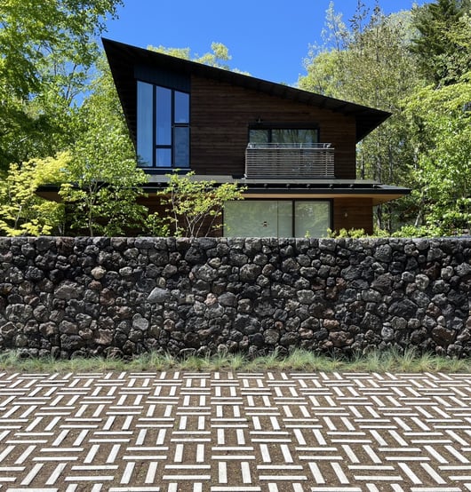 先日庭蒼さんに施工して頂いた、追分の家の駐車スペースの緑化ブロックの隙間の客土には、ダイカンドラの種を混ぜているのですが、私の気が短すぎるのか(笑)、待てど暮らせど芽が出てこず、もともと石積みの手前に確保しておいた植栽スペースに、取り急ぎフェスツカグラウカという、青みがかった玉竜のような植栽を植えて頂きました。黒い浅間石には黒竜!と決めていたのですが、庭蒼さんの粋な提案にあっさり気が変わりまして。早くマリモみたいにふっくらしないかしら❤