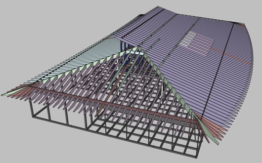 日本列島は杉だらけの森林大国ですが、九州の杉は特に弱いというイメージがあるかと思います。しかし、一つ一つが弱いものであっても、沢山束ねることで強くてダイナミックなジェスチャーになるのではと考え、あえて無等級指定の杉の登り梁を455ピッチで並べ、パッシブデザインに必要不可欠な深い軒を実現しています。