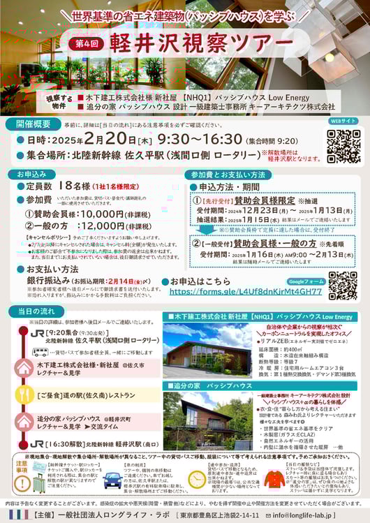 今年も一般社団法人ロングライフラボ主催のパッシブハウス軽井沢視察ツアーが開催となります。一般の方は1/16日より、こちらのサイトからお申込みいただけます。とっても寒さの厳しい2月の軽井沢とパッシブハウスを堪能していただきたく、追分の家では特製のホットワインをお出ししておりますのでお楽しみに!