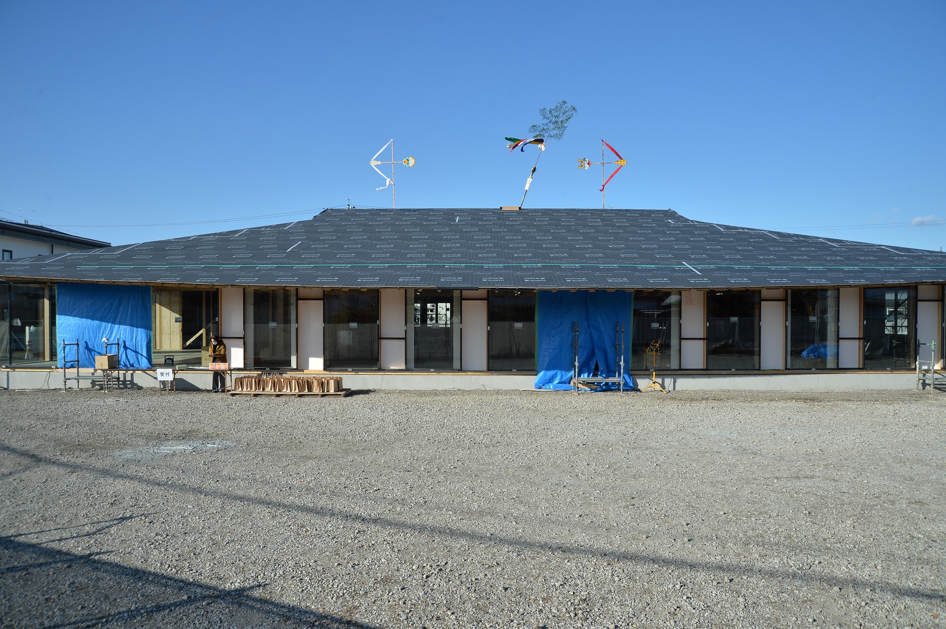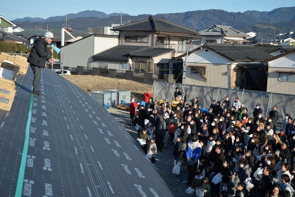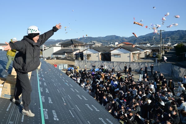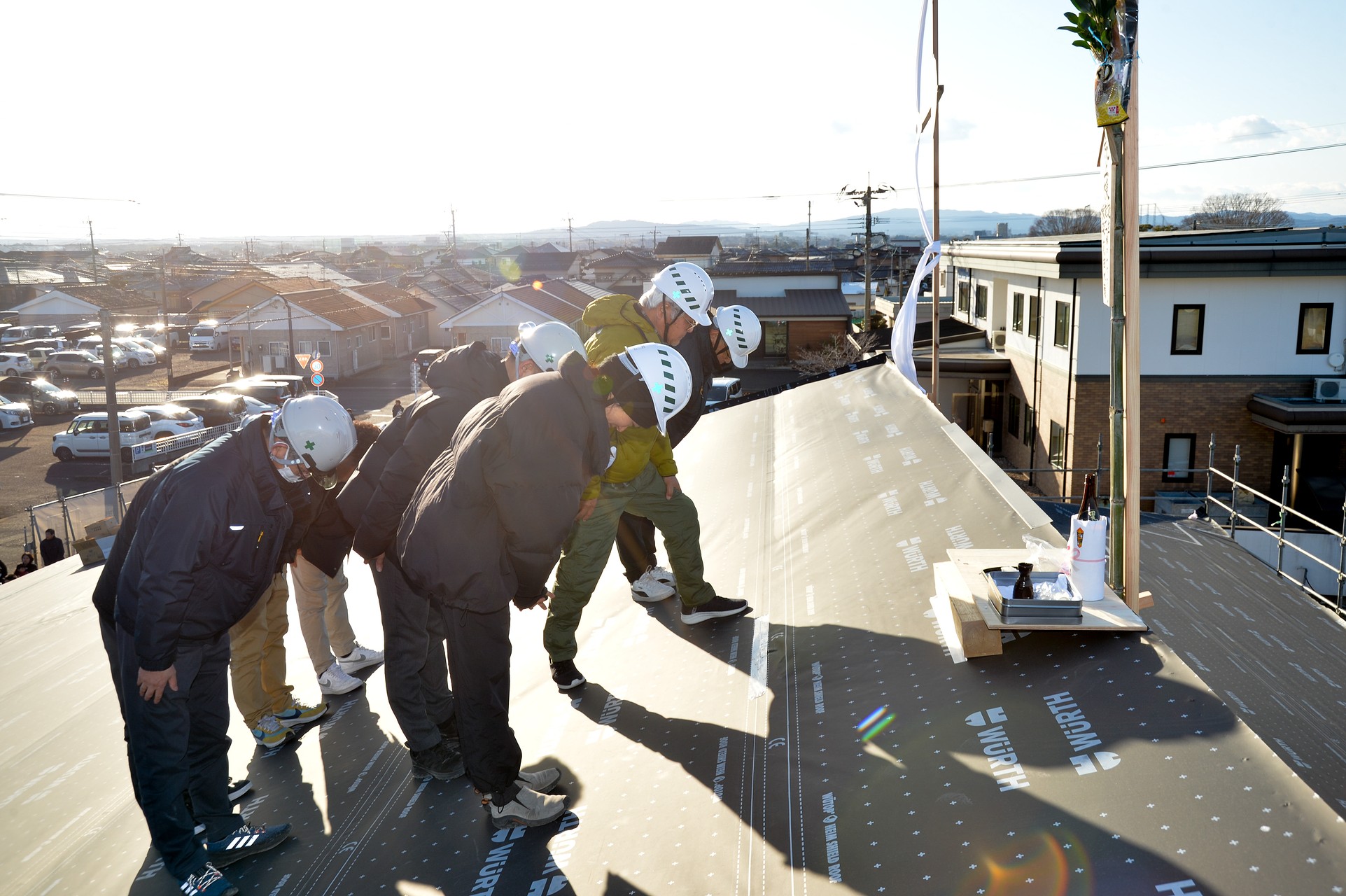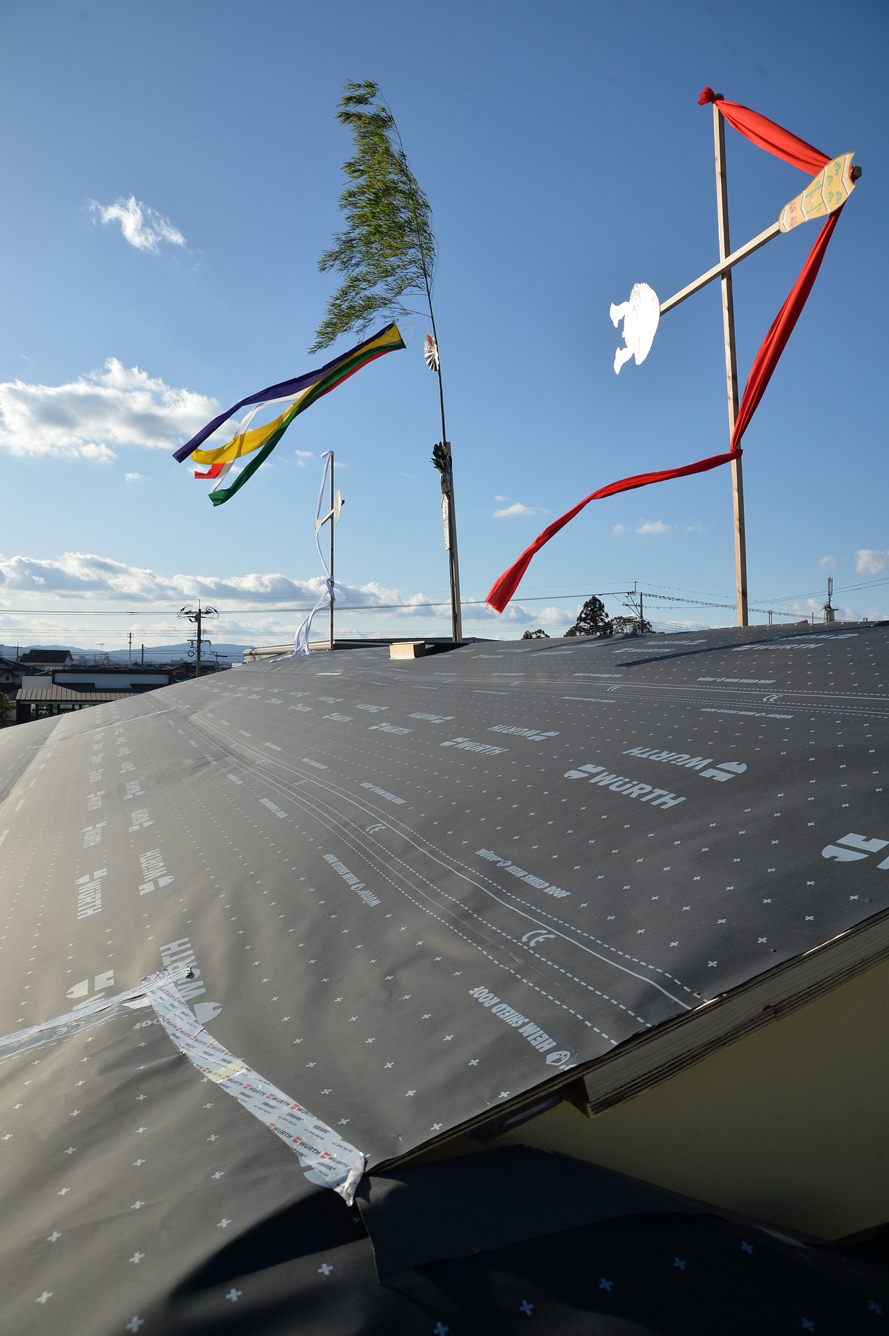 しかも、重役の皆さんと共に屋根の中央部分から餅を撒く係りを仰せつかりまして、ルーフィングの上に貼ってある緑色のテープから外が軒先なので、下に集まってくださっている皆さんまでやたらと遠い!!!次回は餅まきを考慮して軒をデザインしたいと思います(笑)。