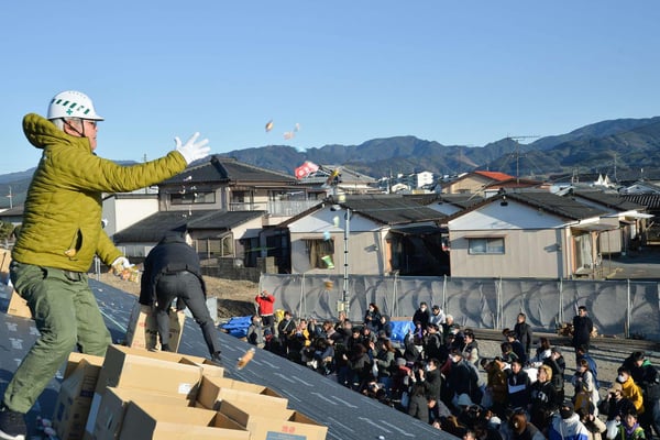 この度は弊社設計のタナカホーム新社屋が無事に上棟式を迎えました。上棟式の際には餅まきをする習わしということで、実はこの仕事に長年携わっておりながら、初めての餅まき参加となりました。