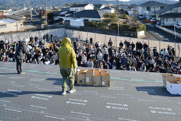 屋根の上にセットされた段ボール箱が風で下に流れ落ちていくくらいの強風で、なかなかスリリングなイベントでしたが、足元が多少傾いていても、強風でも動じないのは学生時代のヨット経験のおかげでした。これはお施主さんたち大変ですね・・。