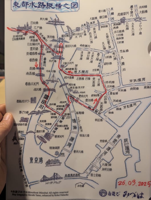 今回廻ったルートは、おそらくこれで合っている筈!東京の水路を知り尽くしたみづはさんの船でご案内頂きました。東京生まれで昔から屋形船好きの私ですが、軽食と飲み物を持ち込むこんなチャーター船の旅は初めてで、今回は季節も良く、大変贅沢な時間を過ごさせて頂きました。